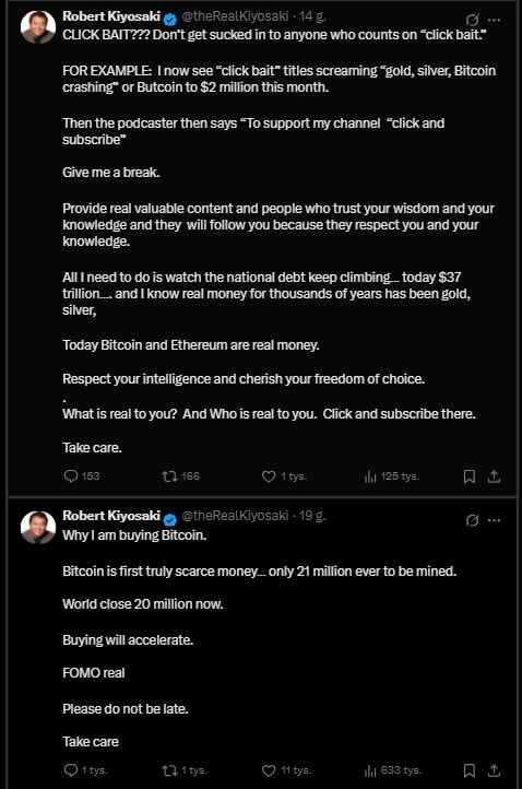 Przypomnijmy, że Robert Kiyosaki – autor, inwestor i jeden z nielicznych głosów, który łączy świat edukacji finansowej z filozofią wolności. Możemy określić go popularyzatorem inwestowania. Teraz mówi jasno: kupuje Bitcoina. Nie dlatego, że spodziewa się szybkiego zysku, ale dlatego, że widzi w nim coś, co przypomina mu złoto i srebro… Oba aktywa oparte na regule niedoboru podaży, a nie na obietnicach ludzi w garniturach. Oto ostatnie wypowiedzi Kiyosakiego na platformie X.