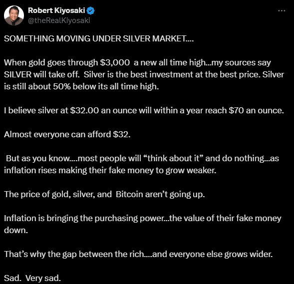 Kiyosaki nie ograniczył się zresztą wyła do kryptowalut. W kolejnym poście wspomina również o potencjale srebra, które jego zdaniem może wzrosnąć do 70 dolarów za uncję, pod warunkiem, że cena złota osiągnie nowy rekordowy poziom 3000 USD. Obecnie srebro kosztuje ok. 32 USD, pozostając ok. 50 USD poniżej historycznego szczytu.