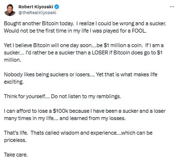 Robert Kiyosaki znów to zrobił. Autor bestsellera „Bogaty ojciec, biedny ojciec” po raz kolejny zaskoczył świat, tym razem informując, że dokupił kolejną porcję Bitcoina. I zrobił to w swoim stylu: bez kalkulacji na zimno, ale z brutalnie szczerą refleksją. „Może jestem frajerem. Ale wolę być frajerem niż przegranym” — napisał na swoim koncie. Ten wpis to nie tylko deklaracja wiary w kryptowaluty. To dowód na to, że Kiyosaki konsekwentnie żyje według zasad, które od dekad przekazuje swoim czytelnikom.