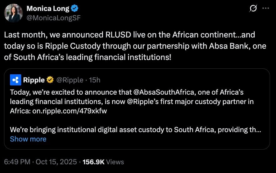 Prezydent Ripple Monika Long potwierdziła najnowszy kamień milowy instytucjonalny firmy — uruchomienie Ripple Custody w Republice Południowej Afryki poprzez strategiczne partnerstwo z Bank Absa. Ten ruch oznacza, że Ripple jest pierwszym oficjalnym partnerem powierniczym na kontynencie. To sygnalizuje przyspieszenie ekspansji firmy na rynki wschodzące.