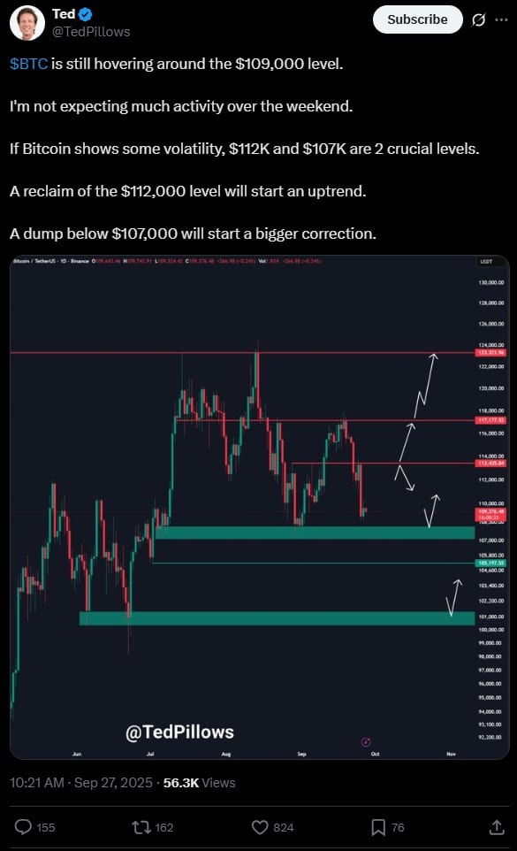 Chociaż sytuacja nie jest dobra dla byków, to przynajmniej zdaje się stabilizować. Jednak nawet do tego stanu jest wciąż daleko. Ted Pillows uważa, że po spadku z poziomu oporu powyżej 113 000 USD,