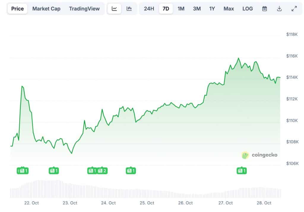 W poniedziałek, 27 października cena Bitcoina wyraźnie odbiła się od stabilnych w ostatnich dniach poziomów, osiągając przedział 115-116 tysięcy dolarów. Poniedziałkowe wzrosty na rynkach kryptowalut zbiegły się w czasie z odbiciem na światowych giełdach oraz napływem bardziej optymistycznych wiadomości ze świata polityki.