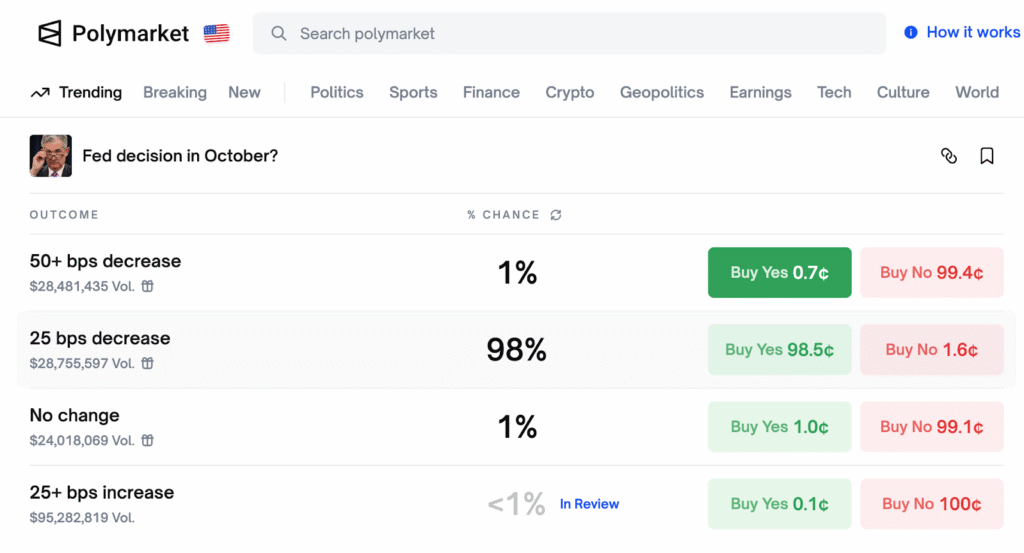 Dane z platformy predykcyjnej Polymarket wskazują obecnie na 98% prawdopodobieństwa, że stopy zostaną obniżone o 25 punktów bazowych. Nie jest to może aż tak optymistyczny sygnał dla rynku jak obniżka o 50 punktów bazowych, jednak wciąż będzie wyceniany jako pozytywna wiadomość.