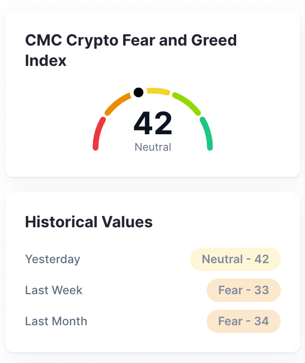 Tydzień na rynku kryptowalut rozpoczął się zauważalną poprawą nastrojów wśród inwestorów. Indeks strachu i chciwości, publikowany przez CoinMarketCap, przesunął się wyraźnie w stronę strefy neutralnej, opuszczając terytorium strachu, które dominowało przez ostatnie dni. Wskaźnik, który przez ostatnie tygodnie oscylował wokół 30 punktów (gdzie 0 oznacza ekstremalny strach, a 100 – ekstremalną chciwość), obecnie wynosi 42, co wskazuje na bardziej zrównoważony sentyment na rynku.