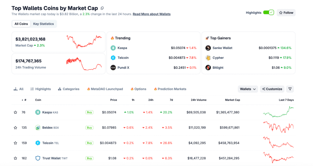 Coraz bardziej atrakcyjne stają się portfele niepowiernicze, gdzie klucze prywatne zostają po stronie ich użytkowników. Portfele kryptowalut przestają również być tylko narzędziem do wysyłki środków, a stają się centrum całego życia on-chain. Widać to także po kapitalizacji rynkowej tokenów związanych z portfelami krypto. Jak podaje CoinGecko same projekty zakwalifikowane w kategorii tokenów powiązanych z portfelami mają dziś łączną wartość rzędu 3,8 mld USD.