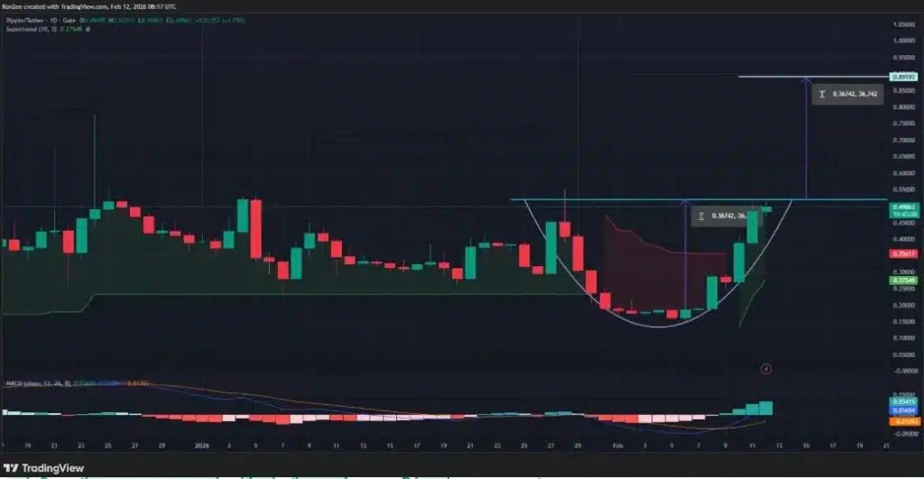 Z kolei crypto.news ocenia, że memecoin tworzy na wykresach formację filiżanki z uchem, co zwykle oznacza kontynuację trendu wzrostowego. Portal dostrzega również, że linie MACD są skierowane w górę, co sugeruje, że „byki nadal mają znaczącą kontrolę nad cenami na rynku„.