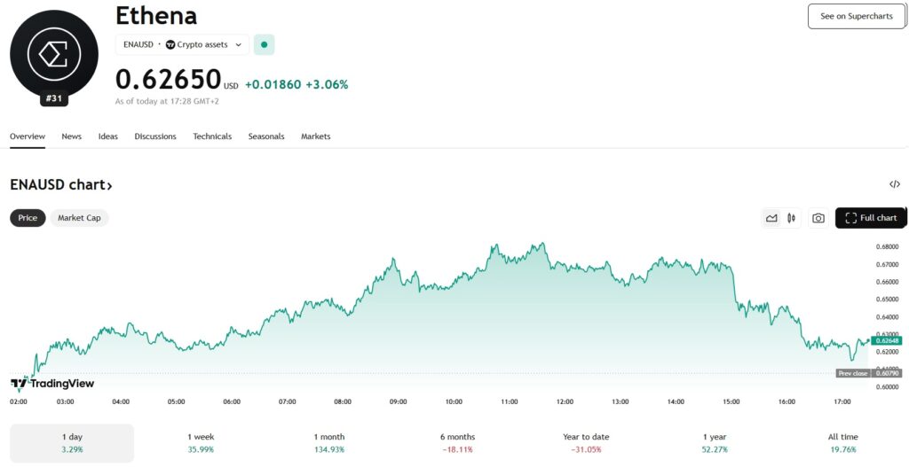 Kryptowaluty mocno rosło w lipcu, ale rzadko który projekt wykręcił wyniki na poziomie TON. W momencie pisania tekstu ENA kosztuje 0,62 USD, a w ciągu ostatnich 24 godzin zyskał 3,29%. Z kolei w trakcie ostatniego tygodnia, gdy konkurencja notowała spadki, Ethena wzrosła o 35,99%. Natomiast przez cały miniony miesiąc token poszybował w górę aż o 134,93%. Co ciekawe te znakomite wyniki nie pozwoliły odrobić wszystkich strat z poczatku roku. Wskaźnik YTD (Yeard To Date) wciąż pali się na czerwono. Od początku roku ENA traci na wartości 31,05%.