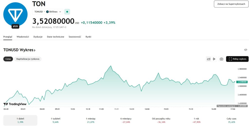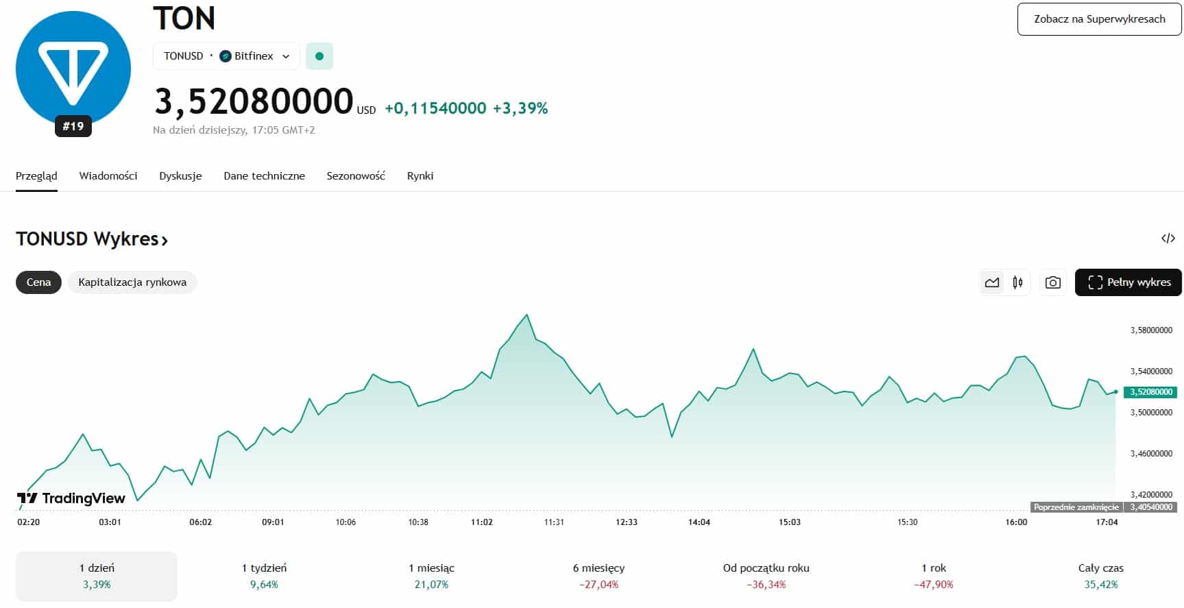 W chwili pisania tekstu Toncoin kosztuje 3,52 USD i tylko w ciągu ostatnich 24 godzin wzrósł o 3,39%. Poprzedni tydzień, który wyhamował większość tokenów, dla TON był całkiem mocny. W tym przedziale czasowym token zyskał 9,64%. Z kolei przez cały miniony miesiąc kryptowaluta wzrosła o 21,07%. Poprawa jest widoczna gołym okiem, ale ciągle jest co odrabiać. Od początku roku altcoin traci na wartości 36,34%.