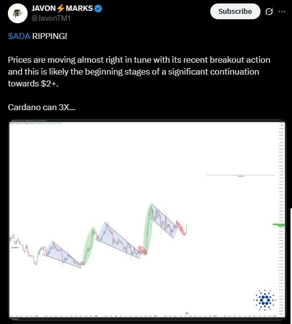Wielu posiadaczy ADA oraz ekspertów zastanawiają się teraz, jak wysoko token jest w stanie zajść na fali, którą złapał w ostatnich dniach. Takich wątpliwości nie ma Javon Marks. Popularny i ceniony analityk rynku kryptowalut w jednym z najnowszych postów na X ocenił, że Cardano jest na dobre drodze, by skoczyć w kierunku 2 dolarów. To oznaczałoby ponad trzykrotny wzrost w stosunku do obecnych ceny kryptowaluty.