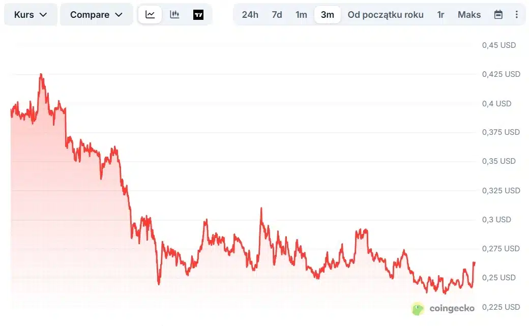 W chwili pisania tekstu ADA kosztuje 0,24 USD, a w ujęciu 24-godzinnym nie wykonał żadnego istotnego ruchu (0,52%). W ujęciu tygodniowym altcoin wzrósł o 1,72%. Jednak w ujęciu miesięcznym kryptowaluta spadłą o 2,75%. Z kolei od początku roku (Year To Date) Cardano stracił na wartości 25,62%. Co więcej, od ostatniego szczytu z grudnia 2024 roku, gdy altcoin kosztował 1,19 USD, token zaliczył 80% krach. Projekt zaliczył w tym czasie również 79% spadek kapitalizacji rynkowe. Pod koniec 2024 roku Cardano zgromadził 41,93 mld USD, a obecnie ma zaledwie 8,93 mld USD.