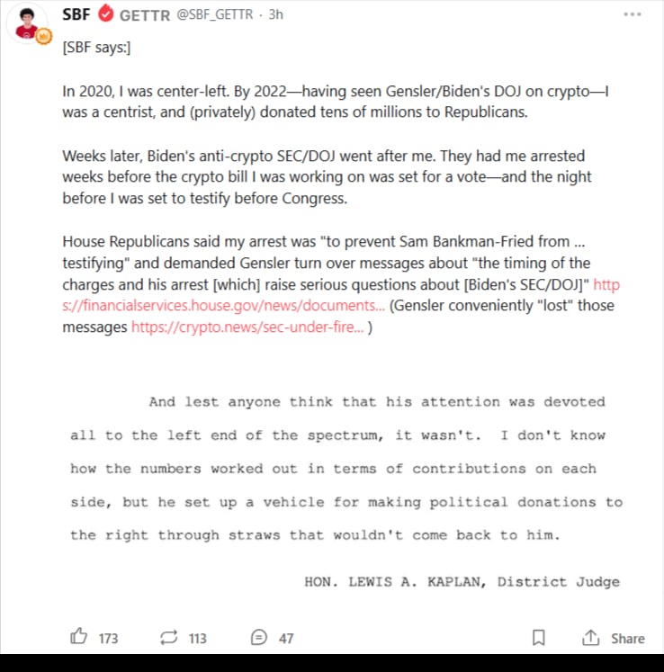 Bankman-Fried, który odbywa obecnie karę 25 lat więzienia za wielokrotne oszustwa i spiski związane z kradzieżą miliardów dolarów od klientów FTX, podzielił się swoimi przemyśleniami w poście na platformie GETTR, rzekomo podyktowanym przyjacielowi, ponieważ sam nie może publikować bezpośrednio.