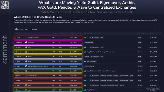 Według Santiment w panelu depozytowym Whale Watcher firmy Santiment w ciągu ostatnich 24 godzin odnotowano kilka depozytów o wysokiej wartości – każdy przekraczający 1 milion dolarów. Największe zmiany to: Yield Guild Games (YGG), Eigenlayer (EIGEN), Aethir (ATH), PAX Gold (PAXG), Pendle (PENDLE) i Aave (AAVE).