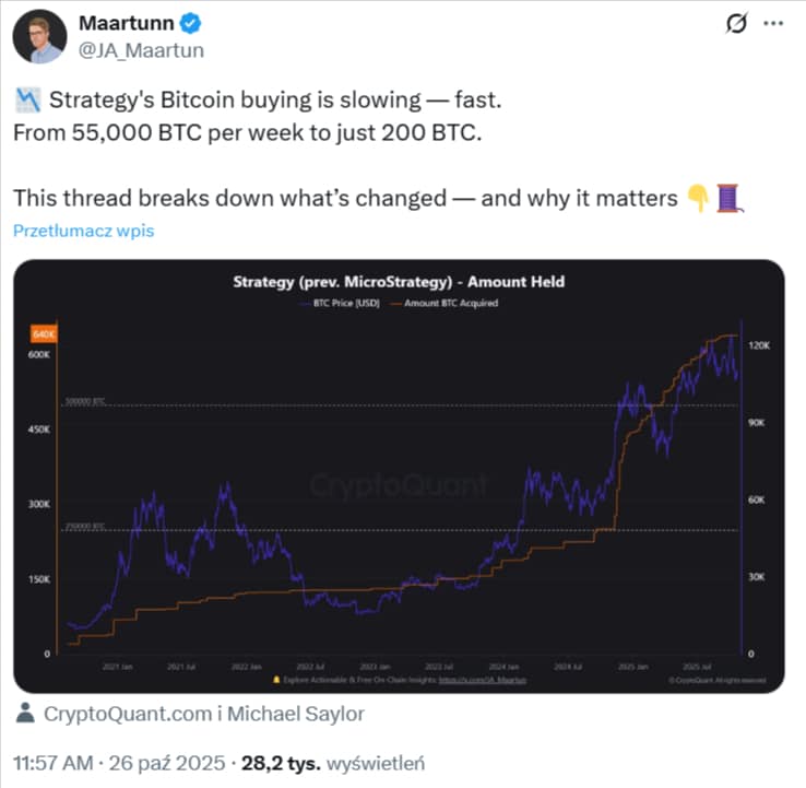 Na platformie X i w mediach branżowych można zauważyć dyskusję na temat zmiany strategii. Niektórzy eksperci sugerują, że mniejsze zakupy mogą wynikać z rozwodnienia akcji spółki (spowodowanego wcześniejszą emisją), co było już podnoszone w kontekście dynamicznie rosnącej ekspozycji na BTC. Analitycy on-chain, tacy jak crptAtlas, podkreślają, że działania Saylora, który zainicjował ogromne inwestycje w Bitcoina, spowodowały wzrost cen akcji MicroStrategy o setki procent. Jednak inni zwracają uwagę, że tempo akumulacji, które w ostatnich miesiącach spadło z ponad 30 000 BTC do nieco ponad 7000 BTC miesięcznie, może sygnalizować zmianę logiki działania spółki.