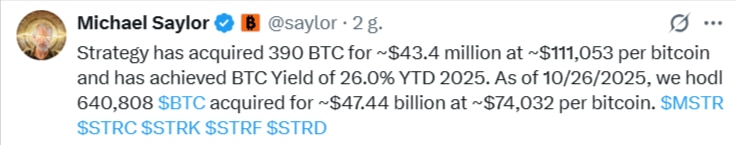 Od 1 do 25 października 2025 roku, spółka dokupiła 778 BTC za około 31,5 miliona dolarów, co daje średnią cenę 40 452 USD za monetę. W ten sposób całkowity stan posiadania firmy wzrósł do 349 758 BTC, nabytych za łącznie 12,87 miliarda dolarów, ze średnią ceną zakupu wynoszącą 36 805 USD.