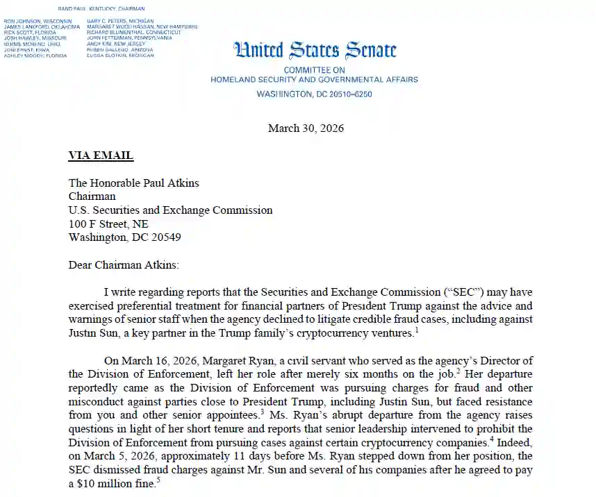 Atmosferę wokół komisji podgrzewa dodatkowo nagłe odejście Margaret Ryan, która pełniła funkcję dyrektora departamentu egzekwowania prawa zaledwie przez sześć miesięcy. Jej rezygnacja nastąpiła zaledwie kilkanaście dni po tym, jak SEC zdecydowała o zakończeniu spraw przeciwko Justinowi Sunowi i jego spółkom. Senator Blumenthal podkreśla, że tak krótki staż na kluczowym stanowisku oraz doniesienia o interwencjach wyższego kierownictwa w toczące się postępowania budzą uzasadnione podejrzenia o paraliż decyzyjny niezależnego dotąd organu.