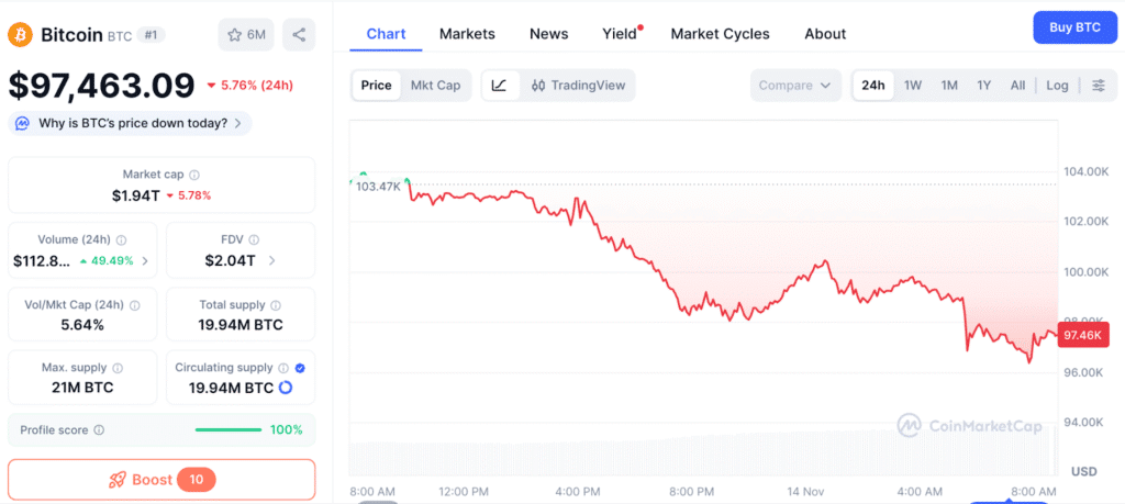 Po zakończeniu shutdownu rządu w USA Bitcoin nie odzyskał siły. Kurs w ostatnich tygodniach poruszał się w przedziale 100–105 tysięcy USD, co sugerowało fazę konsolidacji. Końcówka tygodnia jednak przyniosła wyraźne spadki, które zasygnalizowały dalszą słabość rynku.