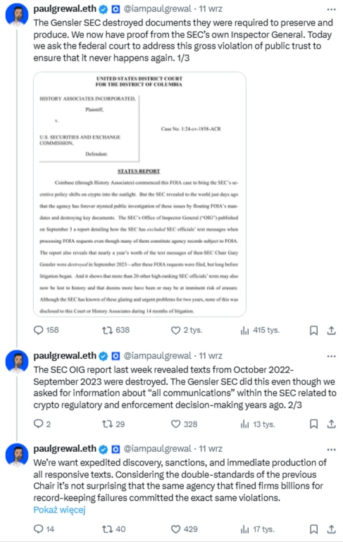 Coinbase uważa, że SEC świadomie zniszczyła dokumenty, które miała obowiązek zachować i przedstawić w ramach trwających postępowań sądowych. Wniosek giełdy jest częścią szerszej batalii prawnej, rozpoczętej po tym, jak SEC pozwała Coinbase w 2023 roku, zarzucając, że firma działała jako niezarejestrowany broker papierów wartościowych. W odpowiedzi Coinbase złożyła pozew, w ramach Ustawy o Wolności Informacji (FOIA), żądając dostępu do wewnętrznych komunikatów agencji, w tym wiadomości tekstowych i dokumentów dotyczących klasyfikacji aktywów cyfrowych.