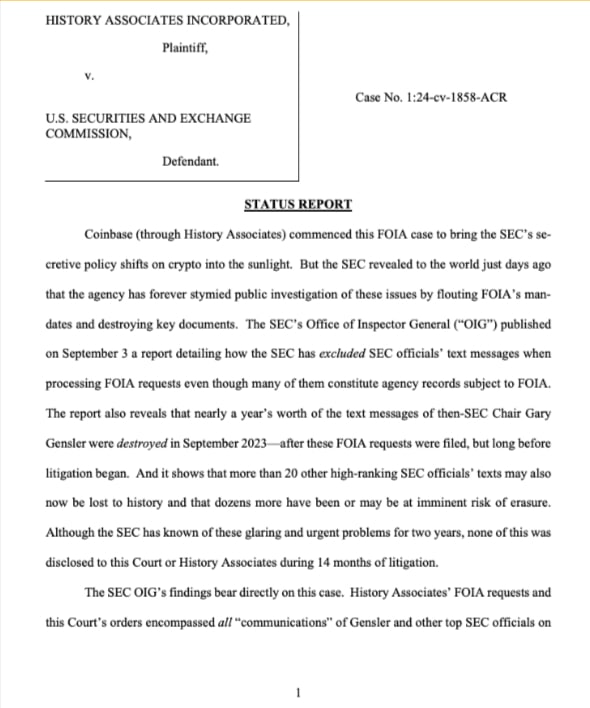 Prawnicy giełdy kryptowalutowej Coinbase złożyli wniosek sądowy, domagając się sankcji i wysłuchania w sprawie utraconych wiadomości tekstowych byłego przewodniczącego Komisji Papierów Wartościowych i Giełd, Gary’ego Genslera.
