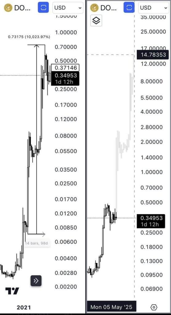 Analityk kryptowalut Ali Martinez zwrócił ostatnio uwagę, że w 2021 r. cena Dogecoina wzrosła z około 0,007$ do 0,73175$ w ciągu zaledwie 98 dni. Dogecoin utworzył podobny wzór, który poprzedzał gwałtowny wzrost, a Martinez zapewnił, że token może powtórzyć podobną akcję cenową, która może potencjalnie doprowadzić go do ponad 32$.