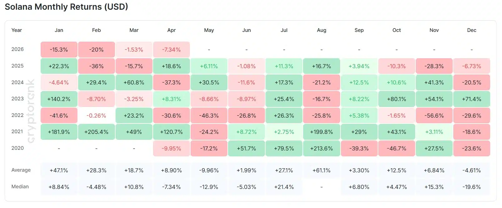 Z danych dostępnych na CryptoRank wynika, że SOL notuje najdłuższą serię spadków w historii swojego istnienia. Altcoin traci na wartości przez sześć kolejnych miesięcy. Zła passa rozpoczęła się w październiku 2025 roku i trwa do dziś. Do tej pory od 2020 roku trzykrotnie zdarzało się, że Solana traciła na wartości przez trzy kolejne miesiące. Zatem obecna serię jest już dwa razy dłuższa, niż poprzedni rekord.
