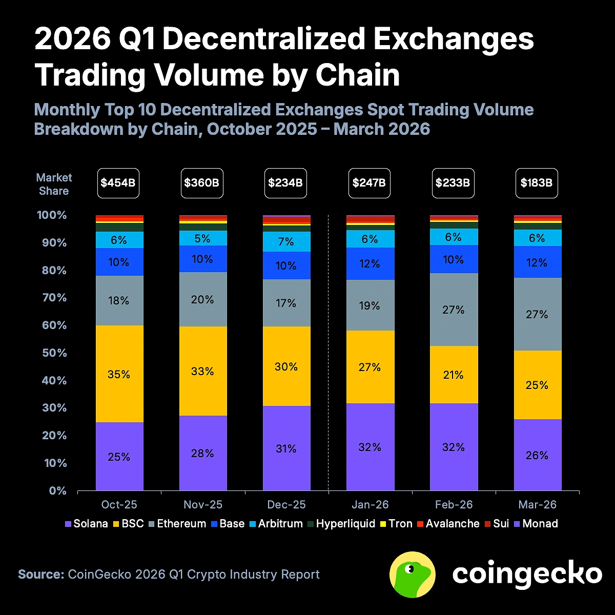 Solana utrzymała pozycję lidera wśród DEX-ów w pierwszym kwartale 2026 roku, zdobywając 30,6% udziału w rynku, mimo wyraźnego spadku wolumenu. Jednocześnie rywalizacja między największymi blockchainami wyraźnie się zaostrza, a Ethereum zaczyna coraz śmielej podważać dominację Solany.