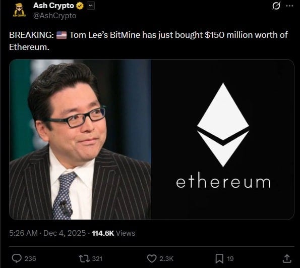 Spółka zajmująca się wydobywaniem kryptowalut, za którą stoi Tom Lee, od tygodni regularnie kupuje ETH. Niezależnie od tego, jakie są aktualnie trendy na rynku, Bitmine powiększa swoje zapasy, nawet kilka razy w tygodniu. Wczoraj, jak informował Ash Crypto, gigant wydał 150 mln dolarów na tę kryptowalutę. Oznacza to, że firma kupiło około 4700 sztuk Ethereum.