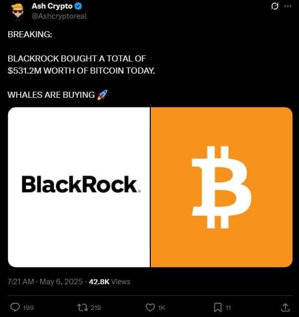 To, co w ostatnim czasie przykuwa uwagę ekspertów to również duże zakupy, których dokonują duże podmioty instytucjonalne. Szczególnie głośno jest ostatnio o BlackRock, który co kilka dni dokłada do swojego portfela kolejną transzę Bitcoinów. Tylko wczoraj gigant zakupił BTC o wartości 531,2 mln dolarów.