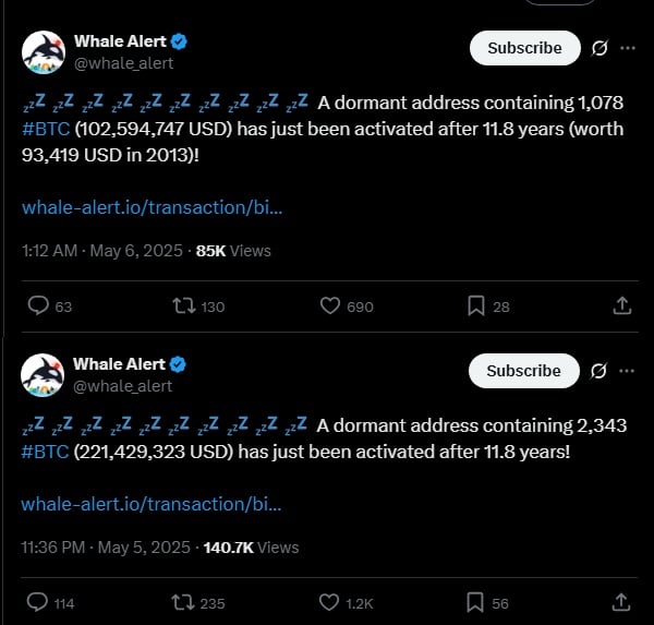 Jak wynika z doniesień platformy WhaleAlert, tylko w ostatnich dnia kilku takich użytkowników powróciło do aktywności na rynku po blisko 12 latach uśpienia. Jeden z nich wybudził się po 11 latach i 8 miesiącach. Na jego koncie znajduje się 1078 BTC o wartości około 102 mln dolarów. W 2013 roku użytkownik wydał na nie niewiele ponad 93 tys. dolarów.