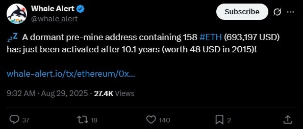 Na rynku są też dużo starsze wieloryby, które również wracają na rynek. W piątek platforma Whale Alert, śledząca ruchy dużych posiadaczy, poinformowała o przebudzeniu starożytnego wieloryba, który powrócił po ponad dziesięciu latach uśpienia. Portfel, który zawiera 158 ETH o wartości około 693 tys. dolarów, przesłał na nieznany portfel zaledwie 0,001 ETH. Jednak rynek spekuluje, że to może być sygnał, który świadczy o gotowość do wykonania bardziej znaczących ruchów.