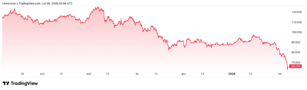 Korekta na Bitcoinie trwa już od kilku miesięcy. Od szczytu w okolicach 126 tys. dolarów w październiku 2025 roku kurs spadł do tegorocznego minimum w rejonie 61 000. W ciągu około 120 dni z rynku wyparowało ponad 1,1 biliona dolarów kapitalizacji.