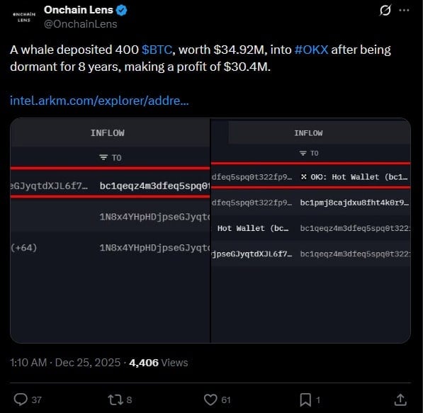Użytkownik, o którym mowa, przeniósł na OKX 400 Bitcoinów, za które otrzymał 30,4 mln dolarów. Zysk jest ogromny, ponieważ koszt zakupu tych BTC osiem lat wcześniej wyniósł około 4 mln dolarów. Takie historie nie są niczym nowym. Co jakiś czas robi się głośno o wieloryby, który po latach wraca do gry i albo znowu akumuluje albo sprzedaje.