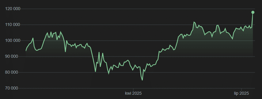 Naturalnie powodem zielonych portfeli jest zieleń na całym szerokim rynku, na czele z Bitcoinem. W ciągu zaledwie kilku- kilkunastu godzin kurs BTC wspiął się do rekordowych 118 755 USD, by później ustabilizować się w okolicach 118 000 USD – to ponad 25 % zysku od początku roku (YTD) i wynik dużo lepszy od siedmioprocentowego wzrostu indeksu małych i średnich spółek S&P 500 w USA i wielu innych pojedynczych akcji wielkich przedsiębiorstw.
