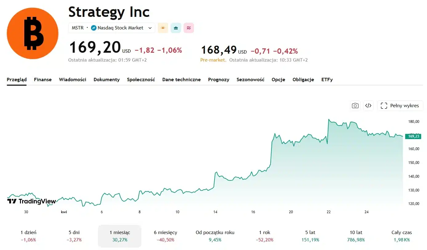W chwili pisania tekstu akcje Strategy kosztują 169,20 USD, a w ciągu ostatniej doby spadły o 1,06%. W ujęciu tygodniowym spółka spadła na giełdzie o 3,27%. Jednak przez cały ostatni miesiąc podmiot zanotował silne odbicie o 30,27%. Co więcej, od początku roku (Year to Date) akcje MSTR zyskały na wartości 9,45%.