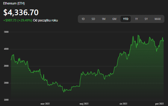 Ether zaczął „Uptober” nerwowo – po nowym rekordzie z sierpnia (ok. 4,95 tys. USD) kurs oscyluje dziś w rejonie 4,3–4,5 tys. USD i jest chwiejny wraz z całym rynkiem. Poniżej zrozumiała mieszanka analizy technicznej i fundamentalnej oraz scenariuszowa wycena na 31 października 2025 r.