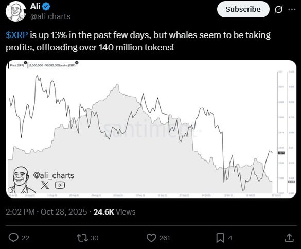 Tymczasem najnowsza informacja o aktywności wielorybów, jest niczym kubeł zimnej wody na rozgrzane głowy entuzjastów. Jak poinformował Ali Martinez, w ostatnich dniach wieloryby sprzedały aż 140 mln sztuk XRP. Ekspert ocenił, że prawdopodobnie duzi posiadacze zdecydowały się na realizację zysków. Jeśli to się potwierdzi, to nie jest to dobra informacja, ponieważ sugeruje, że duzi posiadacze nie widzą sensu w dalszym trzymaniu tokena. Dane, które rozpowszechnił ekspert, pochodzą z renomowanej platformy analitycznej „Santiment”.