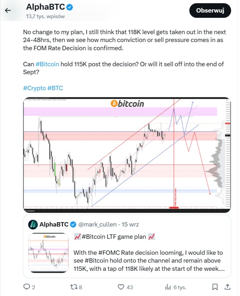 Przebicie tej bariery, zdaniem eksperta, otworzyłoby drogę do nowego rekordu wszech czasów (ATH). Dane z CoinGlass potwierdzają, że poziom 118 000 USD jest kluczowy — heatmapa likwidacji wskazuje na dużą koncentrację zleceń w tym rejonie, co czyni go „soczystym” celem dla byków. Analityk AlphaBTC również przewiduje, że cena może w najbliższych 24 godzinach zmierzać w kierunku 118 000 USD, by następnie wycofać się po ogłoszeniu decyzji FOMC.