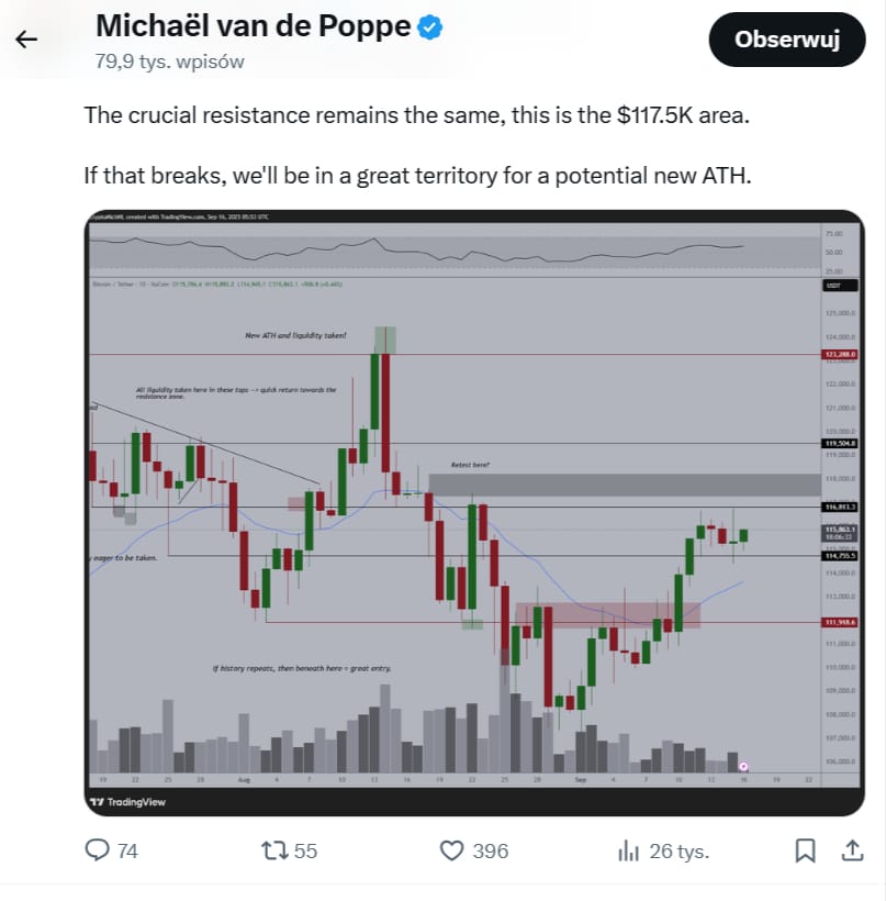 Jak zauważa Michael van de Poppe, założyciel MN Capital, Bitcoin „konsoliduje się w bardzo ładny sposób”, ale „kluczowy opór” pozostaje na poziomie 117 500 USD.
