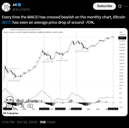 Wskaźnik MACD na miesięcznym wykresie Bitcoina sygnalizuje formację podobną do wcześniejszych momentów osłabienia trendu. Historycznie każda taka sytuacja kończyła się spadkami w przedziale 60–80%. Jednak tamte zdarzenia występowały po zakończeniu faz hossy i stanowiły raczej potwierdzenie zmiany kierunku niż ostrzeżenie przed nią.