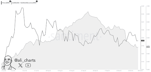 Kluczowym czynnikiem wpływającym na cenę XRP jest zachowanie dużych posiadaczy, czyli „wielorybów”. Dane Santiment pokazują, że wieloryby posiadające od 1 do 10 milionów XRP sprzedały ponad 440 milionów monet w ciągu zaledwie miesiąca.