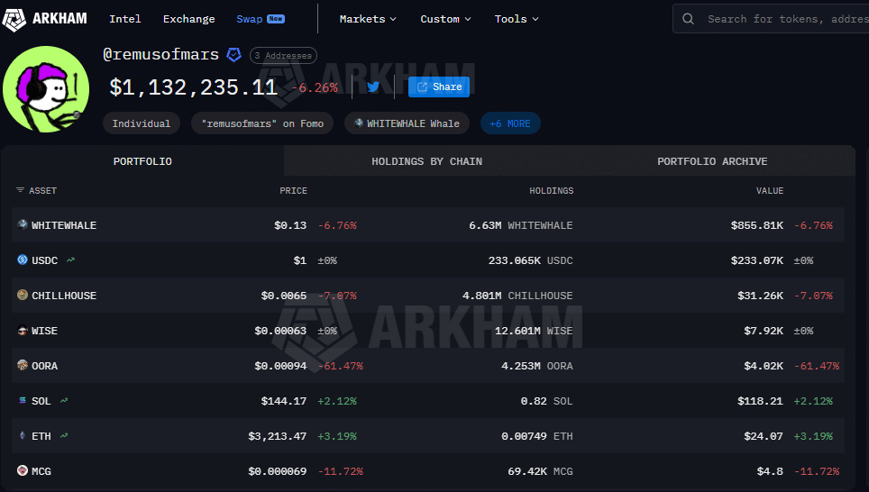Tymczasem Remus sprzedał część swoich zasobów. Arkham donosi, że wydał 220 000 dolarów i nadal posiada 987 000 dolarów w WHITEWHALE. Jednak w chwili pisania tego tekstu w portfelu znajduje się 6,6 miliona tokenów o wartości 855 000 dolarów.