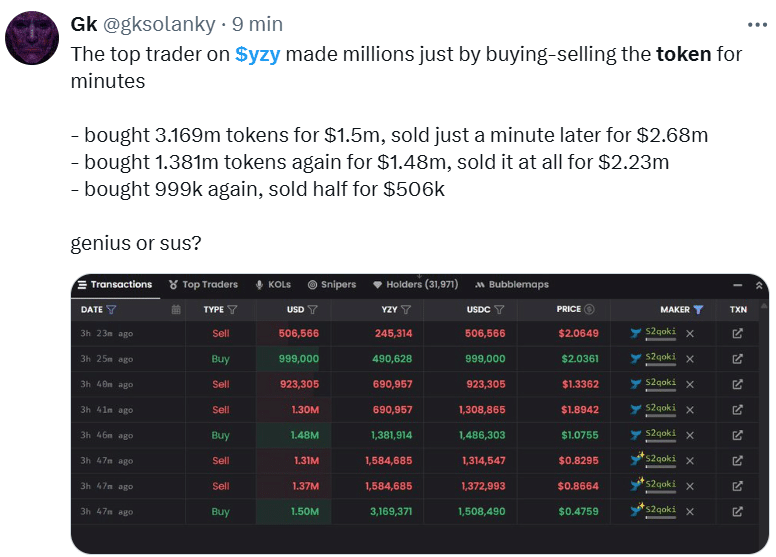 Debiut YZY, co nie dziwi, rozpalił wyobraźnię inwestorów, głównie tych krótkoterminowych. Handel na zdecentralizowanych giełdach Solany eksplodował, a token momentalnie trafił na CoinMarketCap, Bitget i Poloniex. W ciągu kilku godzin YZY był jednym z największych projektów celebryckich w krypto, przebijając takie twory jak TRUMP czy MOTHER. Bańka pękła jednak zanim na dobre zdążono ją napompować.