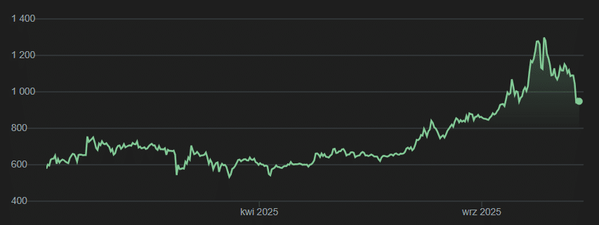 - Wsparcia popytowe: 900–920 USD oraz niżej 870–890 USD — to rejony, w których w drugiej połowie października i na starcie listopada pojawiał się popyt „na przecenie”. Dzienne zamknięcie <900 USD bez szybkiego odzyskania poziomu zwiększa ryzyko przedłużenia korekty. (Bieżące notowania powyżej w widżecie).