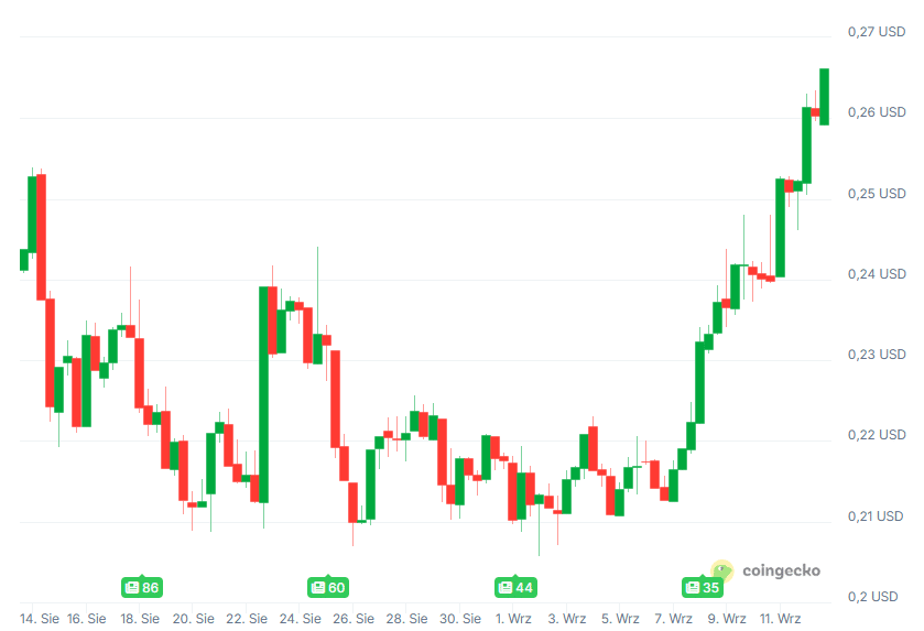 - Cena: ~$0,27; w ostatnich dniach popyt podbiły nagłówki o ETF na DOGE (ticker: DOJE) i wzmożone zakupy „wielorybów”. Analitycy zwracają uwagę na strefę oporu $0,29–0,30 i potrzebę utrzymania zamknięć ≥$0,26. ATH pozostaje z maja 2021 r. (~$0,73).