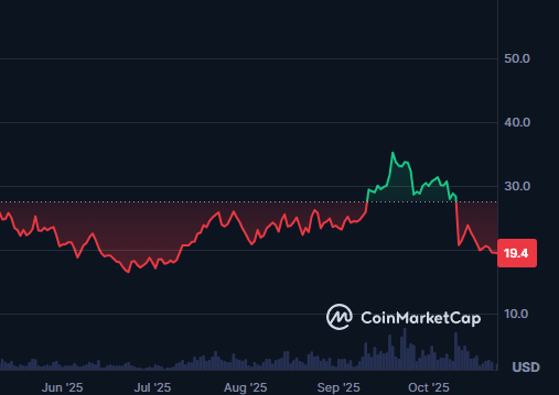 Za: techniczny „reclaim” 21–23 USD, uspokojenie makro i brak negatywnych zaskoczeń z kalendarza odblokowań; neutralnie-dodatni sentyment w DeFi (TVL/DEX). Przeciw: podaż przy 24–25,5 USD może hamować końcówkę miesiąca.
