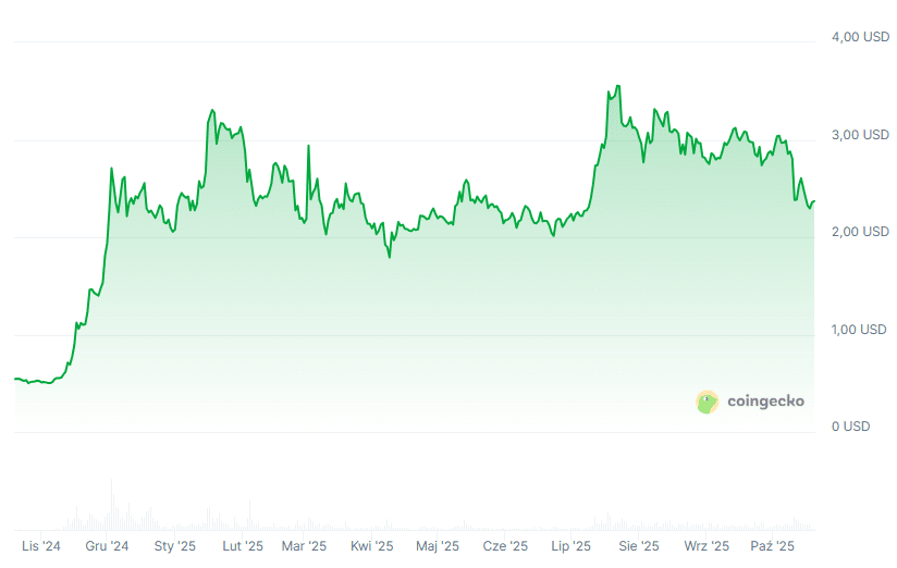 - MACD i inne: Bearish crossover MACD potwierdza presję spadkową, z wyprzedażą instytucjonalną (hodlerzy spadli o 34%). Wsparcie na 2,50 USD trzyma (wyższe dołki), a opór na 3,10-3,15 USD. Awesome Oscillator (AO) jest pozytywny, sugerując potencjalny Q4 rally, jak w poprzednich latach.