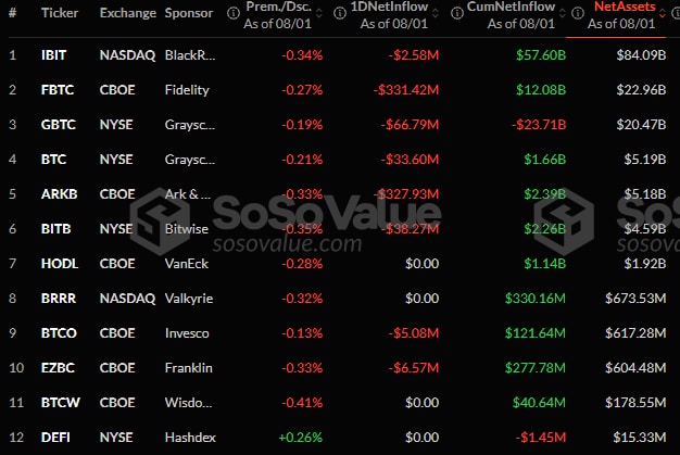 Fundusze ETF na Bitcoina odnotowały rekordowe odpływy netto w wysokości 812,25 miliona dolarów, co stanowi dramatyczną zmianę, jeżeli weźmiemy pod uwagę, że przez cały tydzień mieliśmy do czynienia ze stabilnymi zyskami. Ten nagły odpływ kapitału zniwelował wcześniejsze napływy, obniżając skumulowaną wartość netto do 54,18 miliarda dolarów. Łączna wartość aktywów zarządzanych przez wspomniane fundusze spadła do 146,48 miliarda dolarów, co nadal stanowi znaczącą część, bo 6,46%, całkowitej kapitalizacji rynkowej Bitcoina. Dystrybucja odpływów wskazuje na zróżnicowane zachowania inwestorów, z wyraźnym liderem w postaci funduszu FBTC zarządzanego przez Fidelity, który stracił 331,42 miliona dolarów. Niewiele mniejszy odpływ dotknął ARK Invest, którego fundusz ARKB odnotował spadek o 327,93 miliona dolarów. Nawet fundusz Grayscale, GBTC, mimo mniejszej skali, doświadczył odpływu w wysokości 66,79 miliona dolarów.