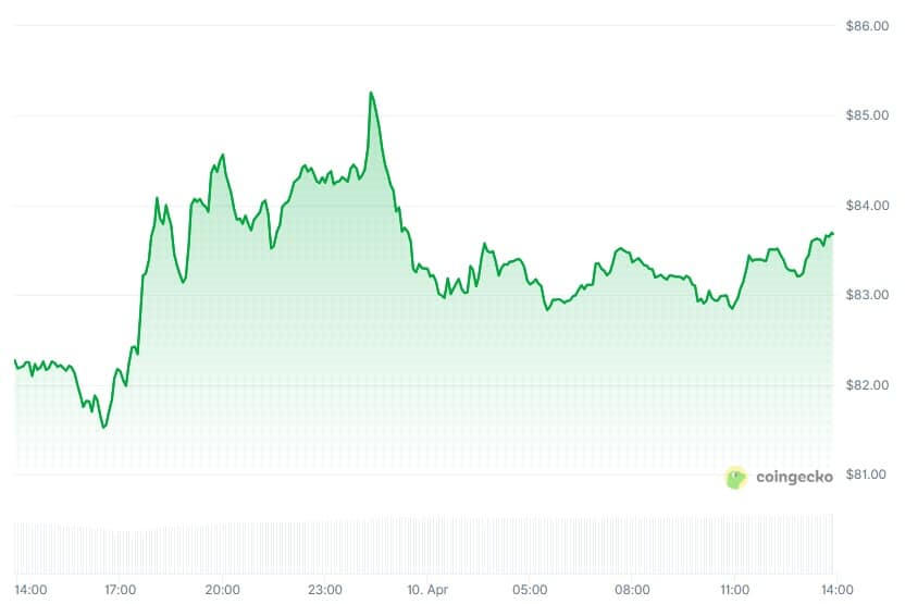 Według danych Solana zyskała 4,5% i dotarła do intra-day maksimum na 85,2 USD, po czym ustabilizowała się w okolicach 83 USD.