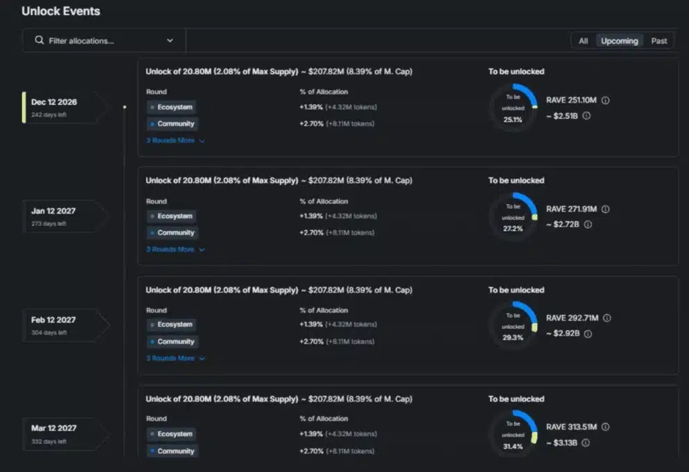 Tak gwałtowne wzrosty generują zainteresowanie, ale jak uczy historia podobnych przypadków, prędzej czy później może dojść do gwałtownego załamania. Warto mieć na uwadze przede wszystkim zmianę podaże. Tutaj kluczowe będą odblokowania tokenów, które automatycznie zwiększają pulę dostępnych tokenów w obiegu. Harmonogram najbliższych odblokowań RaveDAO znajduje się poniżej.