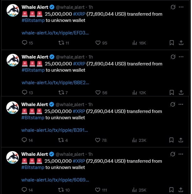 Dane, które opublikowała platforma Whale Alert na X, ujawniły serię złożoną z czterech transakcji, za którymi stoją wieloryby Ripple. Platforma wykryła cztery transakcje z Bitsmap, jednej z najstarszych giełd kryptowalut. Wieloryby wyprowadziły z giełdy na nieznane portfele łącznie 200 mln XRP — każda po 25 mln tokenów.