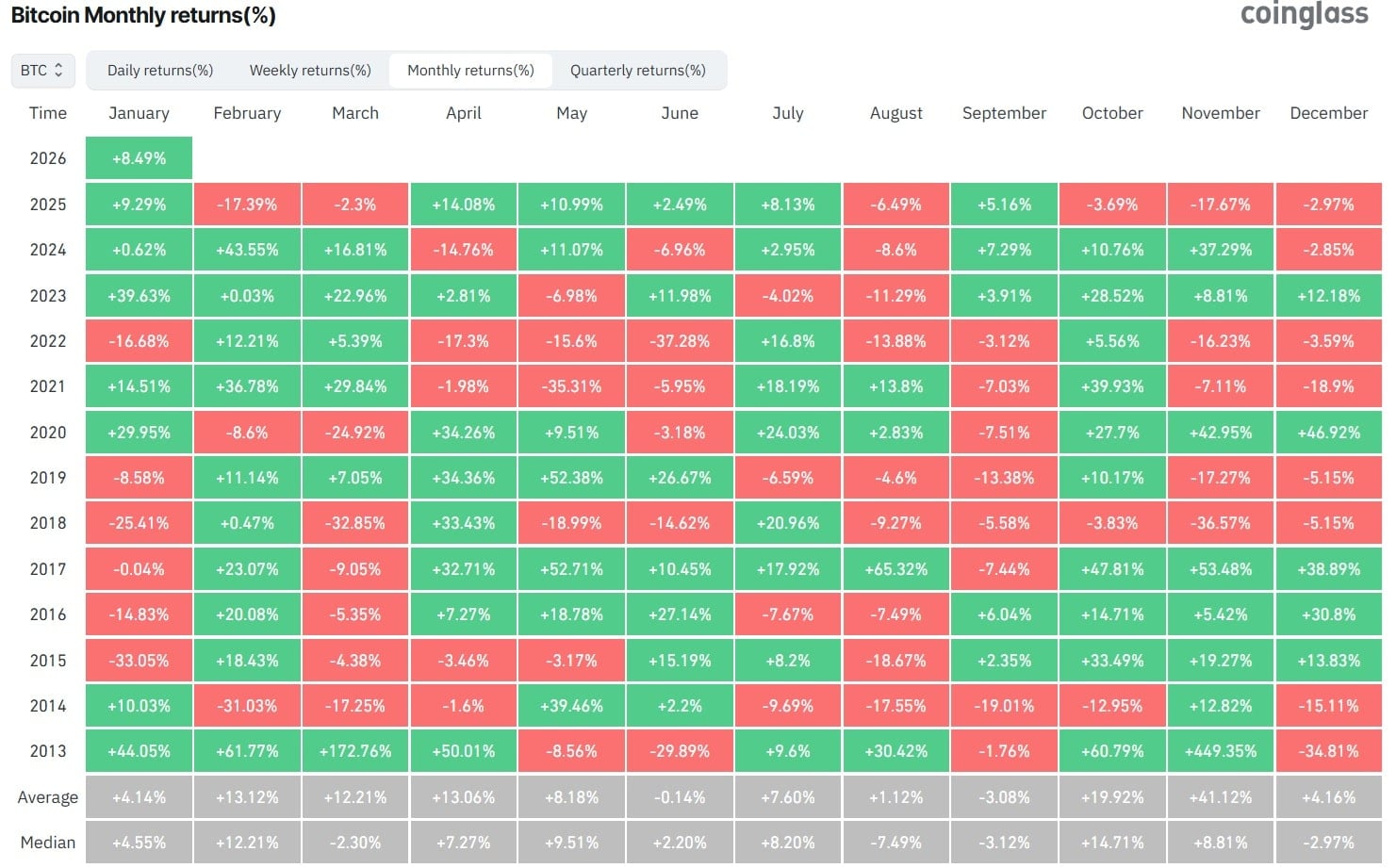 Spójrzmy najpierw na styczeń. Historia pokazuje, że nigdy nie był to ani specjalnie udany, ani słaby miesiąc dla BTC. Dotychczas, licząc od 2013 roku, kryptowaluta kończyła ten miesiąc na minusie sześć razy. Siedem razy pierwszy miesiąc roku przynosił zyski. Co ciekawe od 2020 roku tylko raz BTC zanotował stratę w styczniu – w 2022 roku. Zatem w ostatnich latach był to raczej udany okres dla tokena. Najlepszy był styczeń 2023 roku, gdy BTC zyskał na wartości prawie 40%.